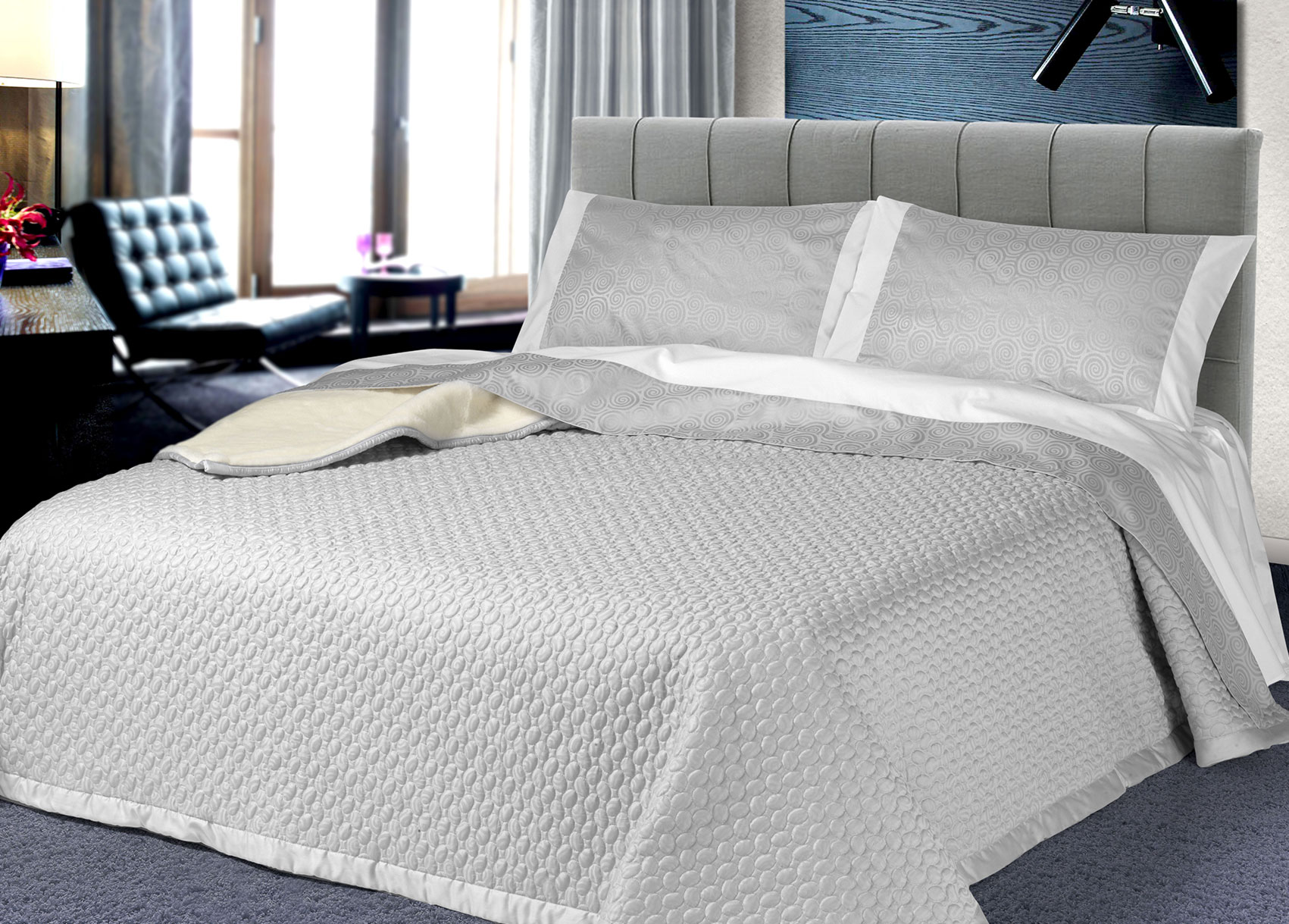 Trapunta lato superiore raso di puro cotone 100%, lato inferiore pelo di pura lana vergine merino pettinata 500 mq non trapuntata.